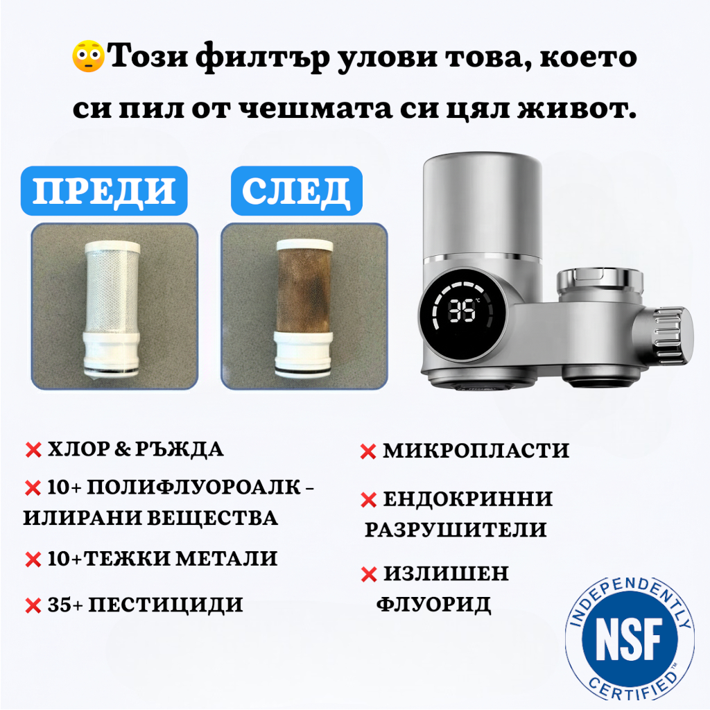 | Вода филтрирана на 100% от вируси, пестициди, хлор и др. | ||