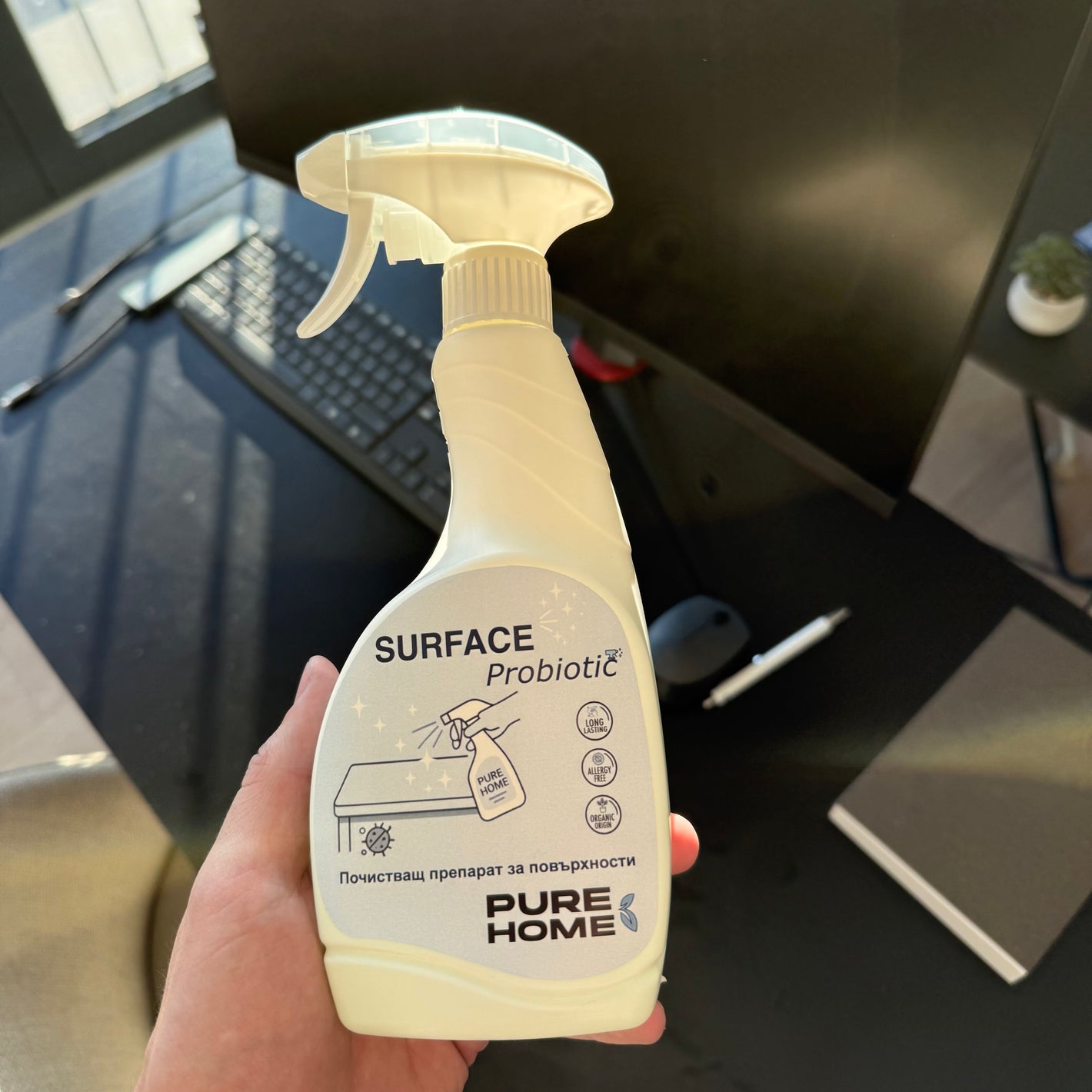 Нашият пробиотичен препарат за повърхности и неутрализатор на миризми се справя с основните замърсявания във всекидневната — прах, отпечатъци от ръце, петна от напитки и храна, както и натрупани органични миризми. Активните пробиотици почистват в дълбочина на микробно ниво, възстановяват естествения микробен баланс на повърхностите и осигуряват до 7 дни активна пробиотична защита срещу замърсявания и миризми.